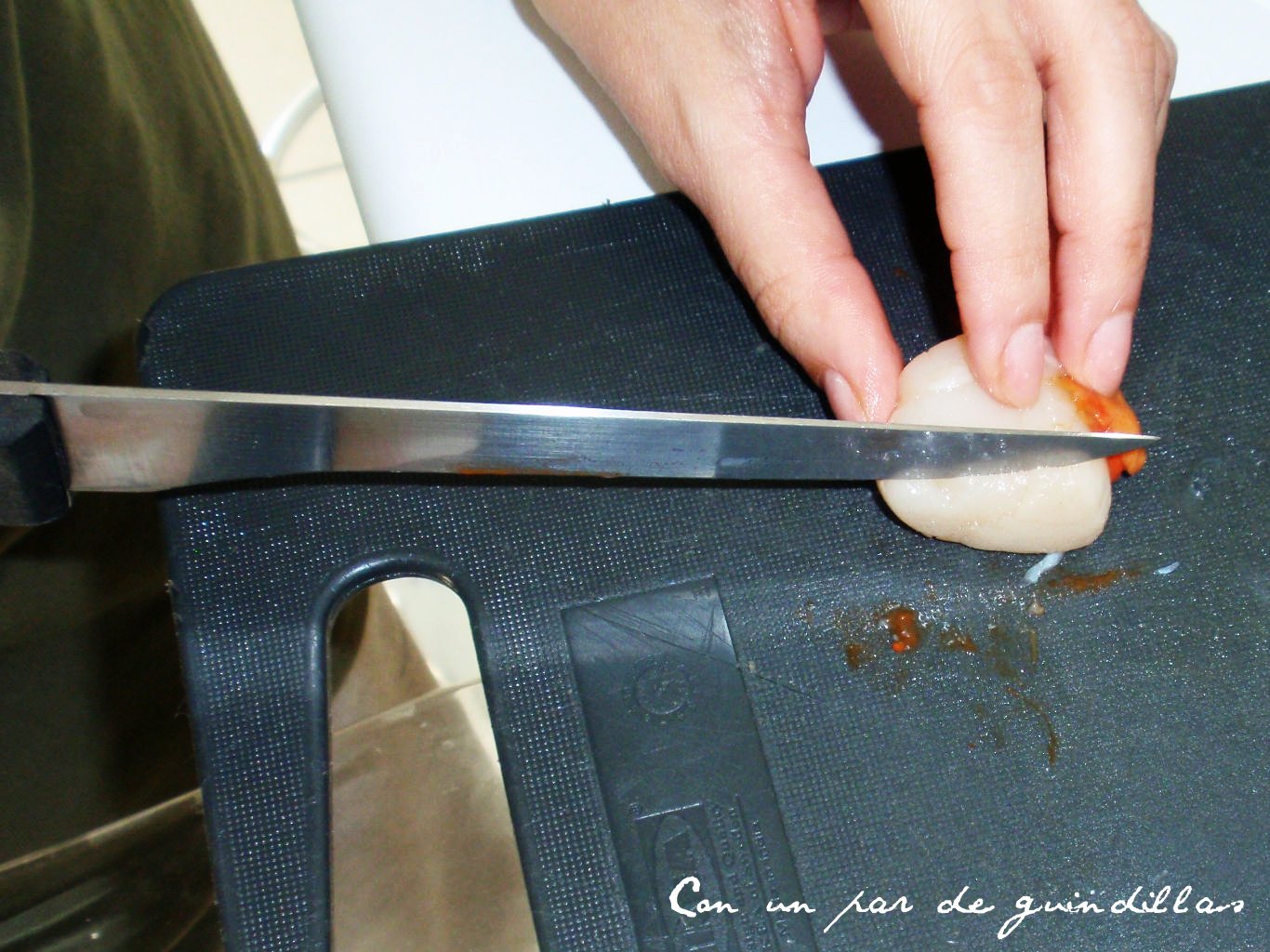 1.- Separamos la carne de las vieiras de las conchas y la congelamos al menos durante 12 horas.