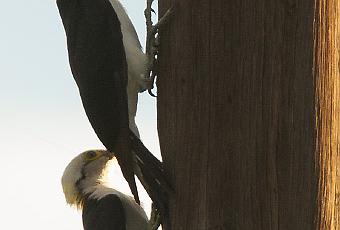 Hacía mucho tiempo que no observaba y fotografiaba al carpintero blanco, la última foto que tengo de esta especie es del mes de Julio del año pasado cuando fotografíe a uno de ellos en el patio de casa. El 18 de Enero cuando volvía del destacamento Nemesio Parma esta pareja se cruzó volando enfrente del auto para posarse en uno de los postes del costado del camino, desgraciadamente quedaron a contraluz pero no iba a perder la oportunidad de fotografiar a esta pareja; este es el resultado.