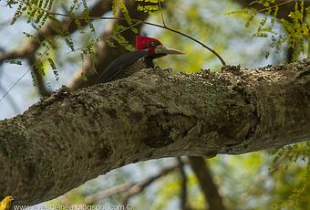 El Domingo 6 de Abril volvimos a encontrarnos con este espectacular carpintero en Rincón Ombú chico; en las fotos que publiqué de nuestra primera visita lo describí por completo así que para escribir un poco acerca de este nuevo avistaje solamente les cuento la anécdota respectiva. Habíamos planificado para este día una caminata de casi 6 kilómetros aguas abajo del club para buscarlo, recorrimos varios pinares caminando por los cortafuegos, caminamos varios sectores de monte, terminamos con las piernas reventadas con las púas del caraguatá )planta que crece en el sector del límie entre el monte y el pastizal) a mi me duró la picazón casi una semana, transpiramos bastante porque el calor se hacía sentir, me caí al suelo por haberme enredado una pierna con una enredadera; todo ello en vano porque no pudimos encontrar al carpintero durante la caminata.