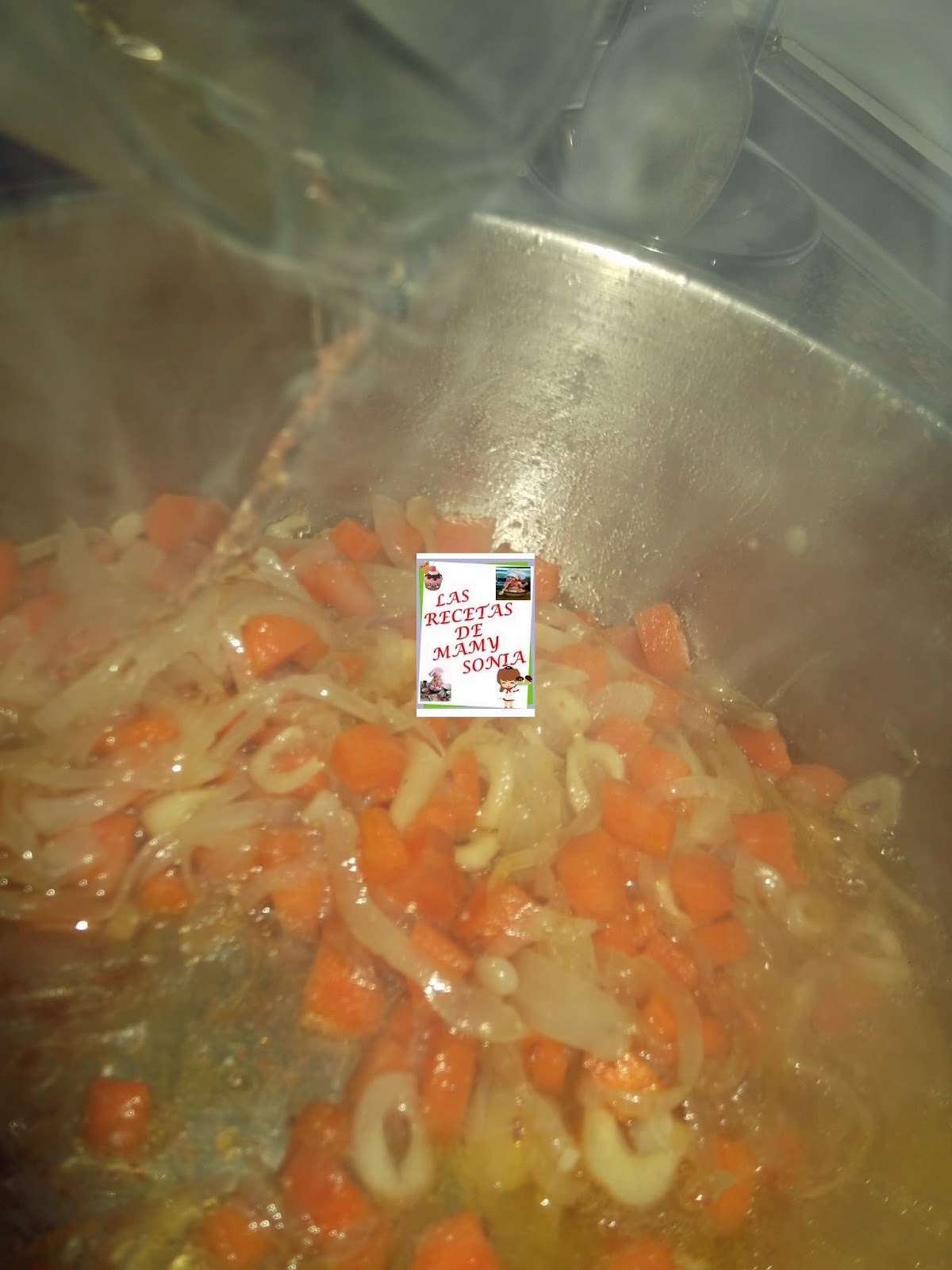 Seguidamente añadimos los ajos laminados y las zanahorias cortaditas y dejamos que se poche un poco más