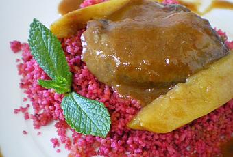 La guarnición para esta deliciosa carne es un cuscús hervido en jugo de remolacha, con lo además aportamos colorido a nuestra receta.