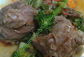 Poner en la cubeta de la GM E el aceite, las carrilleras, la cebolla, los ajos troceados, el vino tinto y la sal, tapar con válvula cerrada, menú guiso 130º, presión III, 20 minutos, dejar despresurizar sola, abrir sacar un poco de caldo y diluir la harina de almidón, añadirlo a la cubeta y añadir la bolsa de verduras previamente descongelada, remover bien, sin tapar la olla programar menú turbo 5 minutos, servir calentito con caldo ó sin caldo al gusto de cada comensal.