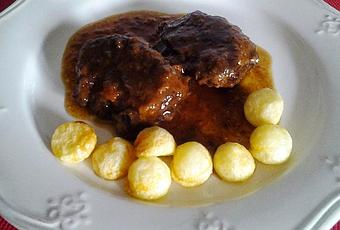 Sacamos la carne y trituramos y colamos la salsa, ponemos las carrilleras dentro y para guarnición, pelamos las patatas y con un sacabocados sacamos bolitas de patata y freímos en abundante aceite de oliva hasta que estén doradas.