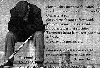 Hay muchas maneras de matar.Pueden meterte un cuchillo en el vientre.Quitarte el pan.No curarte de una enfermedad.Meterte en una mala vivienda.Empujarte hasta el suicidio.Torturarte hasta la muerte por medio del trabajo.Llevarte a la guerra, etc…Sólo pocas de estas cosas están prohibidas en nuestro Estado.