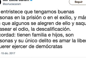 Y en segundo lugar, entendiendo que su particular forma de vivir la mantiene alejada de la realidad, me permito ofrecerle la explicación precedente, para que entienda vd. que esas personas con familias, fueron encarcelados por delinquir y no por ejercer libertad ni democracia alguna, siendo así porque de tal modo lo determinaron los tribunales, desde la independencia jurídica propia de todo Estado de Derecho. Finalmente, le recuerdo algo no menos relevante, y proveniente de alguien no religioso como yo; creo que fue Jesucristo quien dijo “dad al César lo que es del César y a Dios lo que es de Dios”. Su vida, estimada Sor Lucía, dedicada en cuerpo y alma a Jesús, con quien contrajo matrimonio, debe estar tan próxima a las escrituras, como alejada de la mundanal política, que por su propia condición, convendría se abstuviese de juzgar.