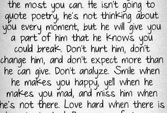 No le hagas daño, no intentes cambiarle, y no esperes de él más de lo que puede darte. No analices. Sonríe cuando te haga feliz, grita cuando te ponga furiosa, y échale de menos cuando no esté contigo. Ama intensamente cuando recibas amor. Porque los hombres perfectos no existen, pero siempre hay uno que es perfecto para ti."