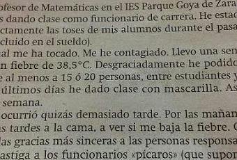 “Soy profesor de Matemáticas en el IES Parque Goya de Zaragoza. Llevo 25 años dando clase como funcionario de carrera. He estado recibiendo directamente las toses de mis alumnos durante el pasado mes (esto va incluido en el sueldo).
