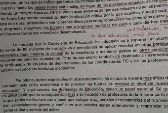 Esperanza Aguirre, la que fuera Ministra de Educación y Cultura hace unos años, escribió hace unos días 21000 cartas destinadas a los 21000 profesores de la Comunidad de Madrid explicándoles las razones que le han llevado a efectuar este nuevo “ajuste” en sus horarios.