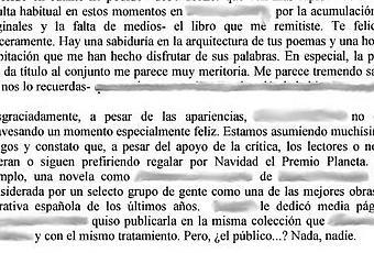 Finales de septiembre: [Autor] escribe a [Editor] comentándole que ha seguido prácticamente desde el principio la trayectoria de sus colecciones, especialmente la de poesía, que admira mucho la labor que la ha convertido en uno de los más interesantes proyectos editoriales del panorama español en este campo; y que, habiendo dado fin a su libro [Título] y pensando en la posibilidad de publicarlo, le gustaría someterlo a su consideración. Sin otro particular, y agradeciéndole de antemano su interés, le reitera su etc., etc., y le envía un cordial saludo.Finales de noviembre: [Autor] recibe de [Editor] la siguiente carta:Estimado amigo:He leído en cuanto he podido —debo decirte que con más rapidez de lo que resulta habitual en estos momentos en [editorial] —por la acumulación de originales y la falta de medios— el libro que me remitiste. Te felicito. Sinceramente. Hay una sabiduría en la arquitectura de tus poemas y una honda palpitación que me han hecho disfrutar de sus palabras. En especial, la parte que da titulo al conjunto me parece muy meritoria. Me parece tremendo saber —tú nos lo recuerdas— que [cita versos del libro]Desgraciadamente, a pesar de las apariencias, [editorial] no esta atravesando un momento especialmente feliz. Estamos asumiendo muchísimos riesgos y constato que, a pesar del apoyo de la critica, los lectores o no se enteran o siguen prefiriendo regalar por Navidad el Premio Planeta. Por ejemplo, una novela como [título] de [novelista] está considerada por un selecto grupo de gente como una de las mejores obras de narrativa española de los últimos años. [Suplemento literario] le dedicó media pagina. [Otra editorial] quiso publicarla en la misma colección que Soldados de Salamina y con el mismo tratamiento. Pero, ¿el publico...? Nada, nadie. En estas circunstancias, me veo obligado a ser muy cauto para poder seguir publicando y manteniendo este proyecto. Pero te digo sinceramente que me gustaría que mantuviésemos este contacto que ahora iniciamos, a ver qué sucede en el futuro. Yo te animo —y esto pocas veces lo hago— a que muevas tu libro por premios y otras colecciones que arriesgan. Además de [editorial], también han aparecido otras, por fortuna.Quedo a tu disposición para cuanto me sea posible. Un abrazo.Finales de enero: entendiendo de la carta anterior que a [Editor] le ha gustado el libro y que el único impedimento para la publicación del mismo es de índole económica, y tras consultarlo con algunos amigos y/o escritores conocidos, así como con personas de la administración de su comunidad autónoma, [Autor] escribe nuevamente a [Editor] comentándole que si el problema es económico, la consejería de cultura de su comunidad ofrece varias posibilidades que lo subsanarían en gran parte, entre ellas la fórmula de coedición con la editorial regional (ya practicada con otros autores y editoriales) o bien las diversas convocatorias de ayudas a la edición, que en ambos casos cubrirían prácticamente los gastos de la misma.Finales de marzo: [Autor] recibe de [Editor] esta segunda carta:Querido [Autor], te agradezco los esfuerzos y el interés por facilitar la publicación de tu libro. Son gestos que no se olvidan.Yo he estado pensándolo bastante durante estas semanas y, al final, tengo que rendirme a la evidencia de que ha llegado la crisis en este inicio de [año]. En relación a la otra carta que te escribí, la situación actual ha empeorado. Hay un exceso de novedades, que se ha convertido en una amenaza para las editoriales. Por tanto, hay que reducir el volumen de publicación, porque el problema ya no es sólo vender o no vender —¡Hamlet!—, sino ahogar a las librerías con novedades o no ahogarlas.De todas formas, estoy seguro de que un libro como el tuyo —y más con un apoyo económico, porque todo ayuda— no tendrá dificultades en encontrar editor. Lo digo y lo deseo sinceramente.Otra cosa que se me ocurre son los premios. En la actualidad [editorial] publica los que me parecen adecuados: [premio de poesía] y [otro premio de poesía]. Este último, por diversas razones, me parece bastante idóneo para tu libro. Pero soy consciente de que ello es dilatar la publicación —y, además, todo premio es una lotería, y yo sólo puedo invitar a presentarse, no garantizar nada—, y de que tú, legítimamente, desees ver publicado tu libro cuanto antes.No sé. Dime algo si te parece. A mí me queda un regusto amargo de todo esto, pero no hay más cera que la que arde. Y el problema es éste: acumular libros o no acumularlos.Mi más fuerte abrazo.Wikio