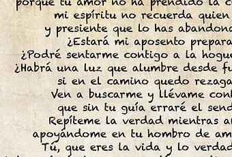 Mi corazón se turba desconfiadoporque tu amor no ha prendido la cera;mi espíritu no recuerda quien eray presiente que lo has abandonado.¿Estará mi aposento preparado?¿Podré sentarme contigo a la hoguera?¿Habrá una luz que alumbre desde fuerasi en el camino quedo rezagado?Ven a buscarme y llévame contigoque sin tu guía erraré el senderoRepíteme la verdad mientras andoapoyándome en tu hombro de amigo.Tú, que eres la vida y lo verdadero¿ahuyentarás lo que me está angustiando?
