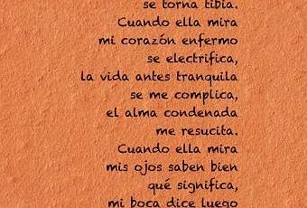 Cuando ella mirael viento que arreciabase vuelve brisa,la horrible tempestadse debilita,la noche destempladase torna tibia.Cuando ella mirami corazón enfermose electrifica,la vida antes tranquilase me complica,el alma condenadame resucita.Cuando ella miramis ojos saben bienqué significa,mi boca dice luegolo que la excita,mis manos desembarcansobre sus prisasy el tiempo se detienehasta que gima.