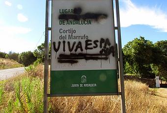 Pues bien, hace unos días se produjo en este lugar un atentado fascista. Fue el pasado 7 de agosto cundo aguien ultrajó el lugar con una pintada en espray negro, borrando la leyenda oficial para sobrescribir encima un ‘¡Viva España!’. De la misma manera, los autores de este suceso también hicieron pintadas en el camino de acceso y la entrada al cementerio de La Sauceda, donde reposan los restos de las 28 personas que fueron encontradas en las fosas comunes del Marrufo en las excavaciones realizadas en el verano de 2012.