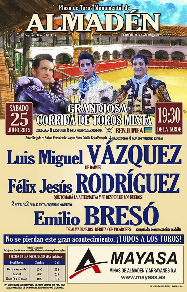 Para los valientes espadas: Luis Miguel Vázquez (de Daimiel), Félix Jesús Rodríguez (que tomará la alternativa y se despide de los ruedos) y Emilio Bresó (de Almadenejos, debuta con picadores).