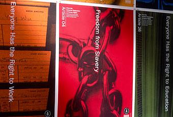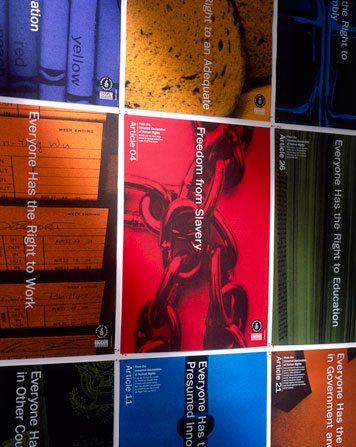 En el año 2002, el artista Woody Pirtle diseñó una serie de carteles utilizando 12 de los artículos de La Declaración Universal de los Derechos Humanos, que fueron distribuidos a las escuelas como parte de la iniciativa que Amnistía Internacional había desarrollado, llamada "Amnistía Educate" . El diseño utiliza la fotografía de objetos comunes para resumir visualmente cada artículo. Los carteles fueron impresos en una gama caleidoscópica de colores que, cuando se cuelga en conjunto, proporcionan una visualización animada en las aula. La intención era hacer de la Declaración de Derechos Humanos un documento "vivo" relevante para los estudiantes. PINCHA AQUÍ PARA VER MÁS