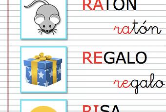 Tal y como puedes observar, estamos aprendiendo la letra R, a la vez que las sílabas que podemos formar (en color rojo) y algunas palabras ejemplo acompañadas de su imagen.