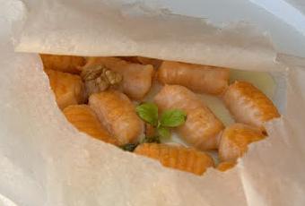 Los ñoquis están hecho de batatas o boniatos, pero puedes hacer esta receta con patata si prefieres. Es una receta muy sencilla y muy sorprendente, ya que cuando abres el papel, sale el vapor con todo el perfume de la Torta del Casar, un queso mundialmente conocido, por su particular textura y aroma. Te dejo el link, por si quieres saber mas Quesos del Casar (click aqui)