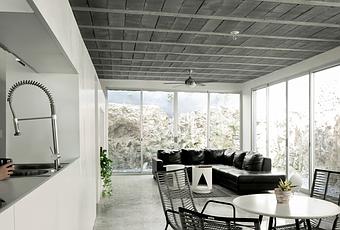 La vivienda se crea para una familia joven con 3 niños pequeños varones, planteándose en dos niveles, con un tercer nivel incompleto a la espera de una expansión futura, cuando sea necesario el espacio para la familia. El primer nivel alberga el área social y de servicios generales. Se piensa una planta libre, encapsulada entre un patio-pasillo lateral y un largo núcleo de servicios interior; con un patio posterior y la cochera. Paralelo al núcleo de servicios se crea un corredor delimitado por un largo mueble que organiza el espacio interior sirviendo a ambos lados. Se crean espacios habitables con secuencias de puertas que forman superficies y volúmenes sólidos de color blanco, que contrastan con la textura y el color del hormigón destinado a las losas del piso. En el segundo nivel se encuentra una sala familiar, el dormitorio principal y dos habitaciones más pequeñas para los hijos. El tercer nivel es una terraza-patio que podrá ser ocupada en el futuro como un área de juegos o estudio.