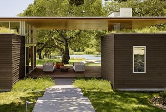 La vivienda tiene volumenes puros y simples, construida con materiales naturales y grandes espacios exteriores.