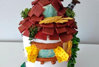 Pues en esta ocasión se trata de una botella de Nordes, que tienen una forma estupenda para hacer casitas. El tejado es de ladrillo rigido cuadrado pintado en color teja, y va con unas cortinillas amarillas chillon con lunares naranjas.