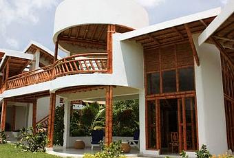 GUADUA (rolliza, lata, esterilla, secciones en canutos) para la estructura, techos, placa de entrepiso, algunas paredes, persianas de ventilación, accesorios decorativos y lámparas.