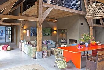 Elementos industriales y otros de apariencia más tosca: vigas de madera, hierro, suelos de cemento, mesas de centro de tronco de árbol, chimenea de fundición, bañera de madera, paredes de baldosas...Mucho