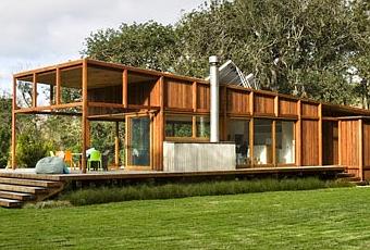 La casa esta totalmente construida en madera rustica y con grandes panos vidriados pero es muy sintetica y clara, los pisos son tambien de madera, a la vivienda se ingresa por una escalera en deck que cubre el ancho del volumen.