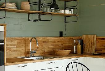 Es la tipica casa de madera, de color blanco en el exterior y un verde grisado interior, que combina estupendamente bien con los techos blancos y el mobiliario en color madera y hierro negro.