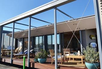Para aligerar costes y marcar su carácter ecointeligente, en su construcción se emplean materiales reutilizados y compuestos de fibra procedentes de la industria náutica. Destacan sus persianas plegables que protegen su interior de las tormentas, capturan luz solar y proporcionan sombra cuando se requiere en los días de calor.