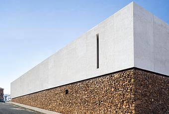 Entre ambos se encuentra la trama orgánica de tejados cerámicos que dada su espontaneidad y naturalidad aún preserva los valores intrínsecos de la arquitectura popular, a pesar de que esta ha desaparecido casi por completo. Se plantea un recinto delimitado por una cerca de piedra del lugar, traída de manera gratuita de los campos cercanos, y cuyo nivel de coronación se mantiene uniforme a lo largo de toda la parcela. Esta tapia delimita el jardín y toma presencia en el interior de la casa a nivel de planta inferior, a la altura de un gran espacio de estar. El plano del jardín se modela topográficamente quedando la piscina en la parte alta, con el mejor soleamiento, y el acceso al salón en la parte más baja, al final de un talud verde. Sobre esta tapia se apoya un volumen prismático ciego.