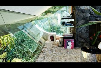 El diseño de Lautner presenta una silueta parabólica icónica que cubre toda la casa, y esta forma se repite en la piscina en forma de ojo que se agregó en 2008, creando un oasis azul en el exuberante entorno de la casa. La escalera exterior ofrece panoramas extendidos del paisaje verde que rodea la propiedad.