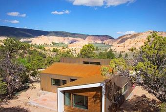 La vivienda, exteriormente es de madera, en integracion prefecta con el terreno lleno de arboles, rocas y aridez en el suelo.