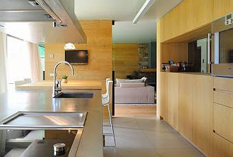 La casa tiene un estilo minimalista sobrio y elegante, con mucha madera y terminaciones modernas.