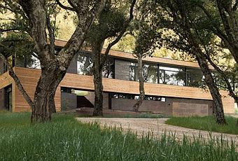 El diseño y la volumetria es de predominio horizontal, revestida en madera y acero.