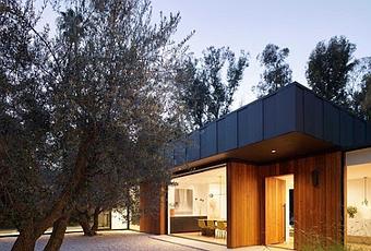 Se distingue exteriormente por una morfologia de tres cubos interconectados por volumenes vidriados, las terminaciones son una combinacion de cedro natural y chapa ennegrecida con cemento.