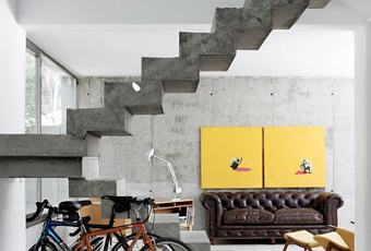 Interiormente combina hormigon, con maderas y mobiliario eclectico, la atmosfera que se crea es de inspiracion rustica y actual
