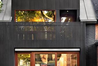 Casa en las afueras de la ciudad de Toronto, Canada.La vivienda, construida con paneles de zinc en la cubierta, es de diseño minimalista , con una volumetria poco frecuente, pero que busca captar la luz en un terreno angosto.