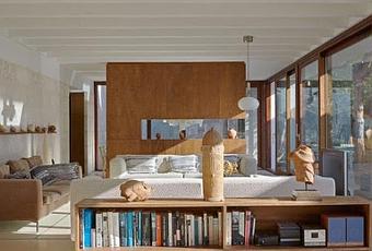 La villa es simple volumetricamente, con interiores muy amplios, iluminados y con carpinteria y mobiliario en madera.