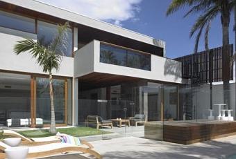 El jardín es principalmente un deck de madera con una serie de espacios distintos, que dan a la piscina. Las palmeras son la vegetación principal que da un aire de oasis al conjunto.