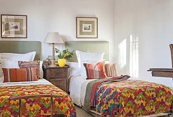 La vivienda esta construida con gruesos muros blancos, de simples revoques pero con un equipamiento y amoblamiento colorido y no convencional.