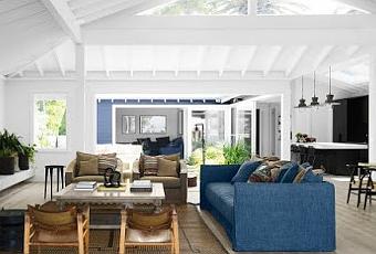 La vivienda, disenada por el estudio de arquitectura Walter Barda y la disenadora de interiores Justine Hugh-Jones, tiene un estilo rustico y playero, esta totalmente construida en madera y pintada de blanco y un azul intenso.