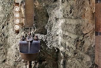 Casa estilo rustica, disenada por el etudio de arquitectura Olson Kundigar Arch.La construccion se adosa integramente en el terreno rocoso, y convive con el hormigon armado y la madera, con un mobiliario muy contundente. En todo el interior hay vestigios de la roca madre que afloran tanto en paredes como en pisos y techos. F. www.archilenta.ru .