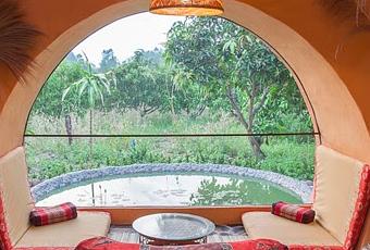 La casa, de forma esferica es una propuesta muy rustica, construida en ladrillos de la zona y revoques sin emprolijar, pintada de color mango fuerte y con muchos detalles interesantes.