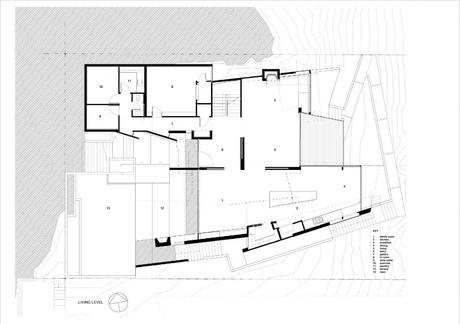 Dos principales gestos formales definen la casa. Ironroofs corrugadas simples envuelven y enmarcan la casa, que ayudan a crear un relationshipwith las casas de la zona. El color verde de estos también helpsthe casa pasan a un segundo telón de fondo de verdor. En contraste con esto, y la vivienda del garaje y dormitorios, un cladelement madera más orgánica se extiende entre los techos de hierro corrugado. Este elemento isinfluenced por el paisaje y que se desliza a través de la casa que createsa oscuridad y fibrosidad que está destinado a sustituir a algunos de que lostby la vegetación eliminada. Las secciones de que se han doblado o cortado tohouse la iluminación de las principales áreas de la planta baja viven. En la planta baja Thereis una piscina y habitaciones sencillas para la familia extendida.