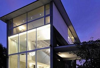 Hacia el interior del lote, la casa logra una amplia continuidad visual a partir de un cerramiento transparente y una terraza de expansión vinculada con el jardín. El volumen esta coronado por una cubierta inclinada y su fachada articulada con planos y volúmenes de distintas texturas, al contrario de lo que sucede en el interior donde la totalidad de los muros son de hormigón visto.