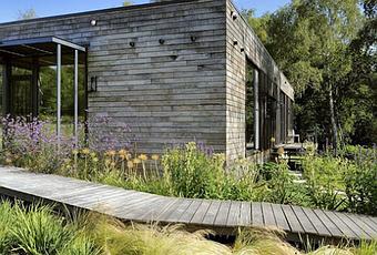 Exteriormente su fachada esta revestida en listones de maderas rusticas, interiormente es muy espaciosa, abierta y moderna.
