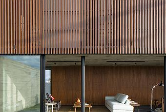 La estructura de hormigón visto configura una planta regular donde se da prioridad a los espacios continuos. Los usos se dividen en niveles, dejando la vida social a nivel de suelo y la vida íntima elevada y aislada. La relación interior-exterior queda definida por los materiales escogidos. El nivel superior queda encerrado por un tamiz de lamas verticales que protegen del sol a los espacios interiores, dan intimidad y generan dos terrazas privadas. El nivel inferior, delimitado por una lámina de vidrio, queda en contacto máximo con el entorno y con áreas que se extienden a todo el terreno.