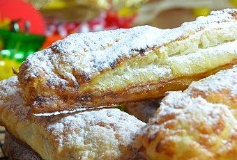 Cortamos la masa en rectángulos de 12cm de largo x 9 cm de ancho . En el centro ponemos una cuchara de las postre del relleno . Pintamos los extremos de la masa con huevo batido o agua y se enrolla dándole dos vueltas. Presionamos con un tenedor y con un cuchillo o palo de brocheta se pinchan para que una vez en el horno , salga por ahí el vapor y no se revienten. Las barnizamos bien con huevo batido y llevamos a hornear a 200º una media hora aproximadamente, dependiendo de cada horno.Retiramos y las dejamos tal cual o espolvoreamos azúcar glas por encima.También se le puede poner azúcar grano antes de meterlas al horno, pero a mi me gustan mas con el glas una vez hechas.