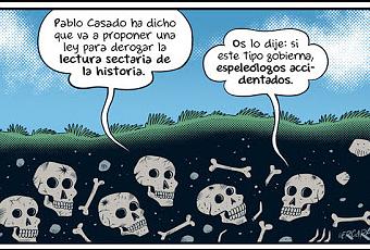 Y, ante las posibles acciones de justicia y reparación propuestas por el gobierno, hoy –todavía insuficientes—, Casado se ha opuesto frontalmente a la ley de la Memoria Histórica –nada extraño, no hace tanto llamó carcas a los que reivindicaban justicia y enterramiento digno para las víctimas republicanas— y pretende una ley que llama de Concordia y Libertad, y que es la Ley del Olvido, cuyo fin ignominioso y vergonzoso es dejar las cunetas con cadáveres republicanos y olvidar a las víctimas, por lo que se ve, ‘víctimas inexistentes y de tercera fila’ si se las compara con otras víctimas de otros terrorismos. Y eso que hablamos de más de 100.000 muertos y de millones de torturados, excluidos, encarcelados, emigrados y discriminados por haber defendido la legalidad vigente y la democracia.
