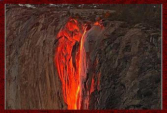 Curiosa y espectacular ilusión óptica debida a que cuando el sol se pone, el salto de agua se ilumina desde atrás por el resplandor rojizo de los rayos del sol generando lo que se conoce como cascada de fuego o lava.