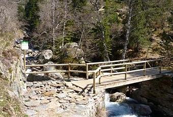 Para ello hay que llegar al fondo del llano donde se encuentra un puente de madera, el Pont Boavi. Cruzamos y seguimos por un sendero, con fuerte desnivel y en zig-zag, a través de un frondoso bosque. Encontramos árboles que nos cortaron el camino y tuvimos que sortearlos. Seguimos la marcha hasta que no pudimos avanzar más al encontrar una pared de nieve bloqueando el camino. No obstante llegamos al principio de la zona de cascadas.